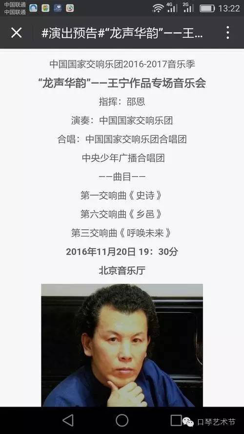 那是在2016年11月19日的早上7:30,我被电话声吵醒。这是周六。电话里传来急促而熟悉的曾在中国文联工作过的林大姐的声音,她让我赶紧起床,10:00去中国交响乐团排练,有一个交响曲需要口琴,明天晚上要在北京音乐厅正式演出。我当时还在睡梦中,迷迷糊糊的,以为她跟我开玩笑呢!可她接着问我几点去接她,我才猛然意识到这是真的了……我飞快地洗刷完毕,匆匆忙忙准备口琴。由于林大姐没告诉我用啥口琴,啥调的,我只好带着一套“东方鼎”套琴及一只半音阶口琴赶往中国交响乐团排练厅。在路上我跟林大姐说,我很忐忑,我经常跟口琴团队演出或者跟录音伴奏吹,但从来没跟这么的交响乐团一起演奏过,吹什么旋律,多大难度我都不知道,我会很紧张的。她说以前听过我的口琴演奏,觉得肯定能胜任。