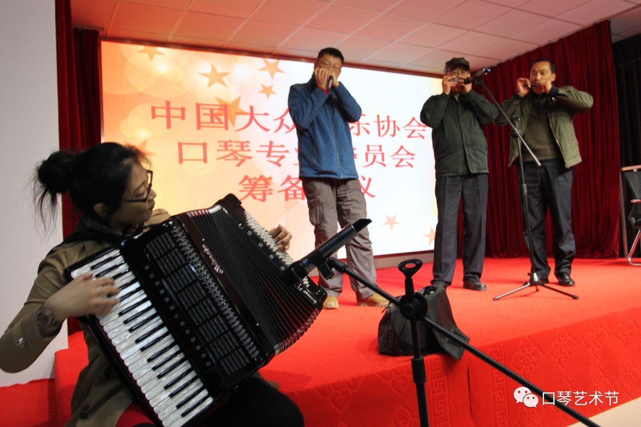 This is Yu Lingling, the Secretary General of the Chinese popular Music Association, played an accordion,There are three piano friends playing harmonica , perfect cooperation.