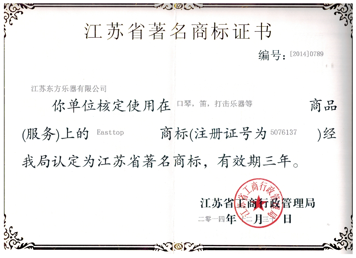 喜讯:江苏东方乐器有限公司的Easttop商标被工商行政管理部门认定为江苏省