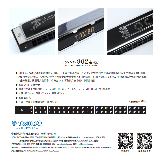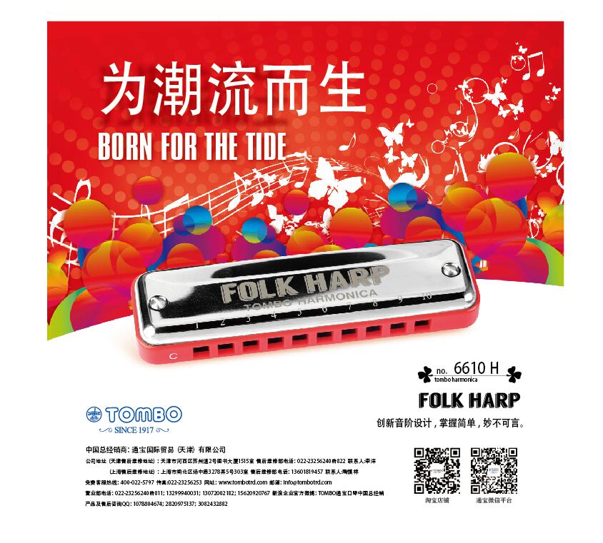 通宝国际贸易(天津)有限公司是(株)蜻蜓(TOMBO)乐器制作所投资建立的,其成立宗旨是为了更好地服务于中国广大口琴爱好者。主要销售日本(株)蜻蜓(TOMBO)乐器制作所的产品,包括单音、复音、重音、半音阶、和弦、贝司等系列的口琴产品,可供不同用户选购。同时还提供与口琴音乐相关的口琴演奏信息、CD、教材、乐谱等附属软件。还组织各类口琴演出及口琴教学活动,以及接受广大口琴爱好者的咨询,提供超的服务。希望广大爱好者能够更多地使用我们的产品,满意我们的服务。