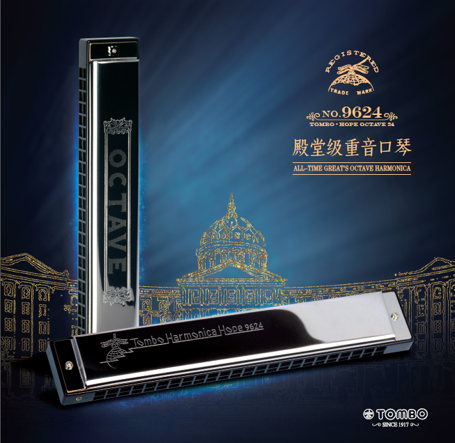 NO.9624 是通宝音域宽的重音口琴,上下簧片音高相差一个八度。时尚复古的设计与堪比NO.9521的优美音质相结合,让使用者身心愉悦。风琴般的音色不论独奏或者重奏都有不俗的表现,再加上亲和力的价格,使得此款口琴在通宝产品线中分外耀眼。 该型号产品授予“小海盗de口琴舰队”在中国市场销售。