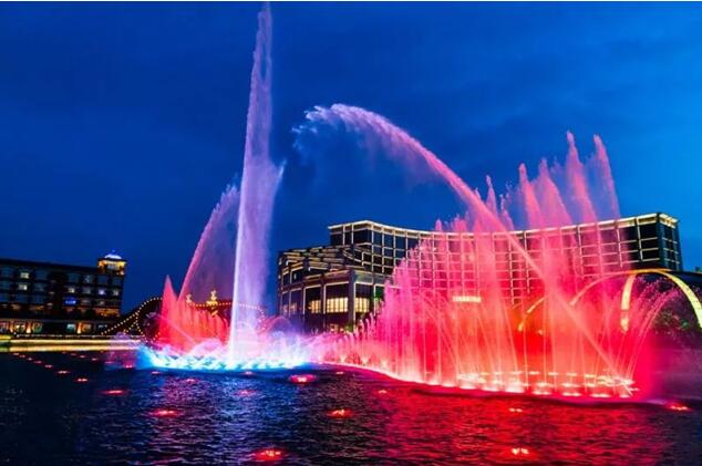 at 19:00 p.m., with the sound of music resounding,the fountain dances freely with the music, colorful and beautiful. This is a feast of both vision and hearing.