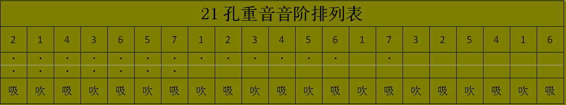 这款21孔重音口琴上下簧片相差一个八度,音域宽广,具有风琴的音色,在小合奏中作为中音声部有非常好的效果。目前我们推出的调别有C和C#,下面是音阶排列图。