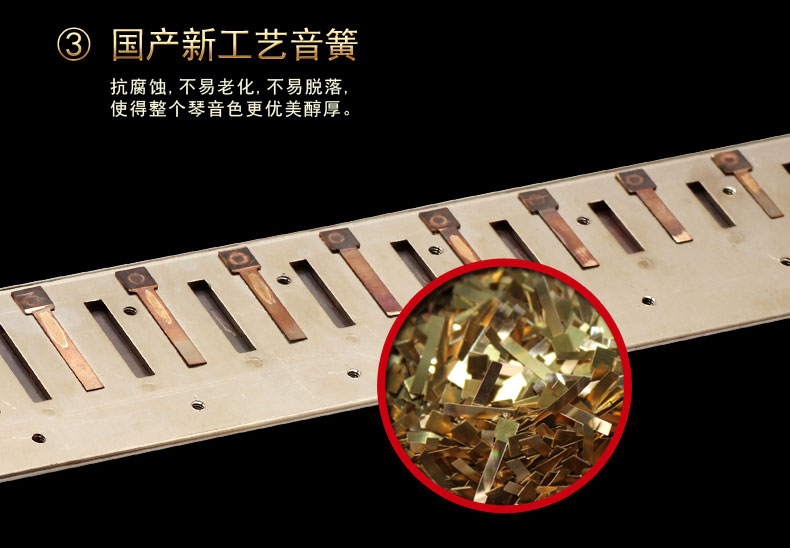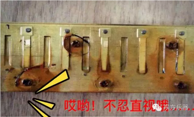 口琴的“心脏”--音簧,材料采用的是青铜合金制成,电焊工艺,让黄片更加贴合座板,更加牢固。不易产生砂音、哑音。