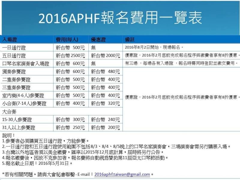 受第十一届亚太口琴节(2016台湾)主办方委托,由于国内琴友不能方便 及时登录十一届亚太官网, 为了让琴友们及时获取相关资讯,将在首届华夏口琴艺术节官网行业新闻中发表亚太口琴节相关消息,方便参赛人员浏览,敬请关注!