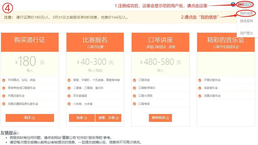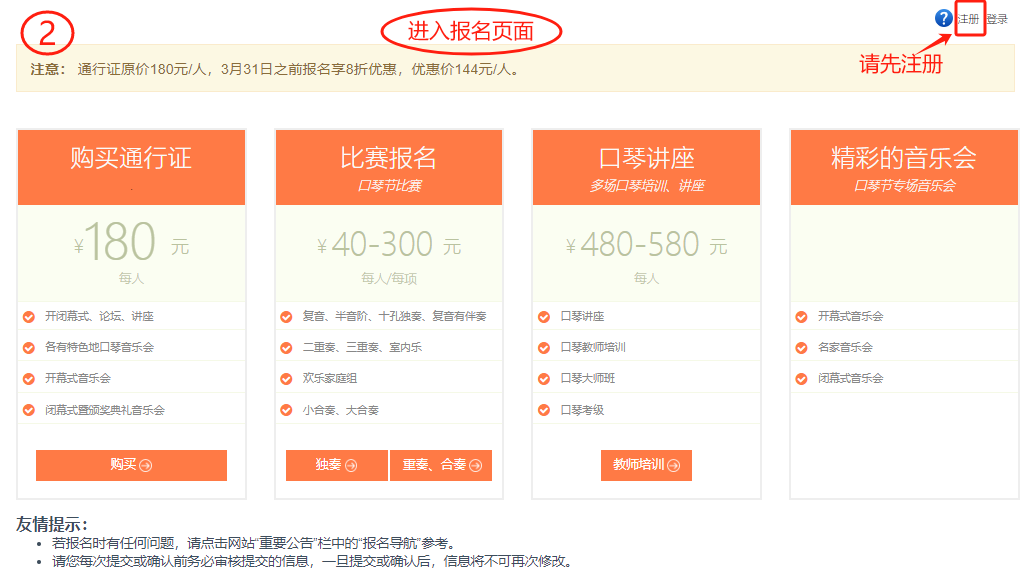 华夏口琴艺术周作为国内规模较大的口琴活动,其发展历程不仅见证了口琴音乐在国内的蓬勃兴起,也成为了连接全国琴友、促进口琴文化交流的重要平台。从2015年在北京的首届盛况,到2023年在新昌举办的第四届华夏口琴艺术周吸引超过2800名参与者,每一届都以其独特的魅力和深远的影响,为我国口琴艺术的推广与发展做出了巨大贡献。为弘扬中国口琴文化,继续推动中国口琴音乐事业的发展,第五届华夏口琴艺术周将于2025年7月23日~27日在福建省宁德市蕉城区举办! 报名时间:2025年3月1日-5月31日。 通行证180元/人,在4月1号前报名者,通行证优惠至144元/人。更多优惠详情见“赛事详情”。 注册: 第一步:登入官方网站:www.hxharmonica.com,点击“我要报名”。 ![]() 第二步:进入报名页面,点击“注册”。