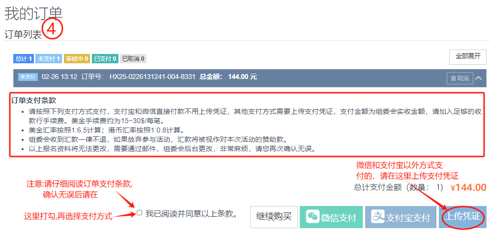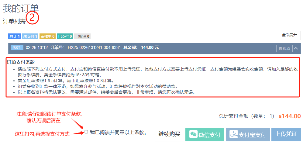 第二步:请在“订单列表”中查看您的订单,点击“全部展开”可看到订单内容,如果您发现某个订单不需要了,可点击该订单上的“取消”,或者您发现该订单有误,那么你也可以点击“取消”然后重新再报(前提是未付款)。并且仔细阅读订单条款内容,确认无误打钩,按提示完成付款。(付款方式参考购买通行证的付款步骤)