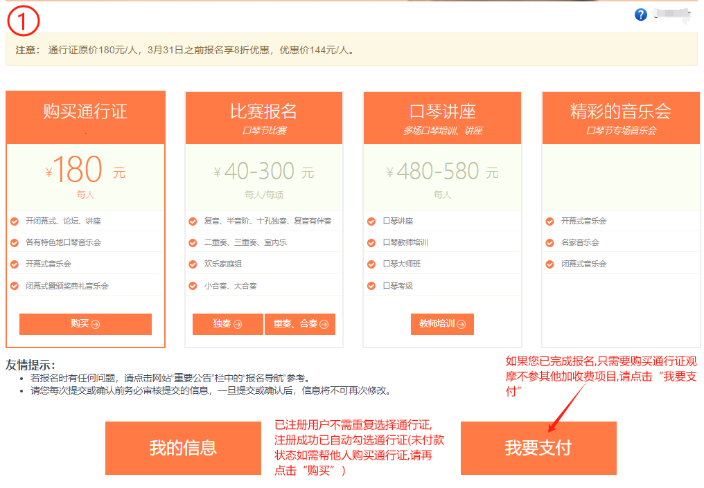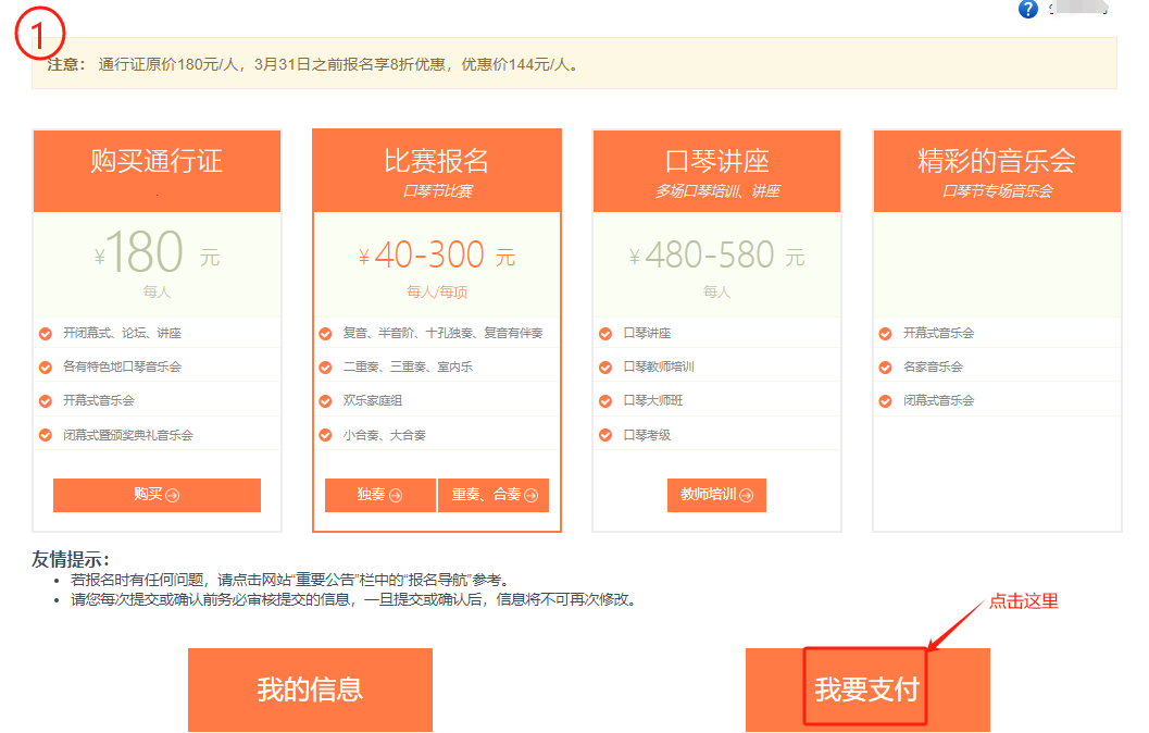 费用支付: 第一步:当您完成所有项目的报名后,并确认要付款,请回到报名首页,点击 “我要支付”