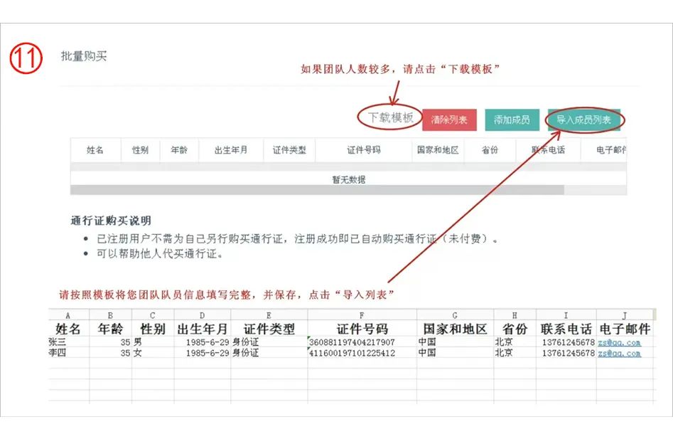 第十一步:如果团队成员很多,可进入“购买通行证”在下方批量购买右侧点击“下载模板”--根据模板将您团队所有成员的信息正确填写,保存模板,点击“导入成员列表”,这时您会看到所有的成员信息在网页的列表中。