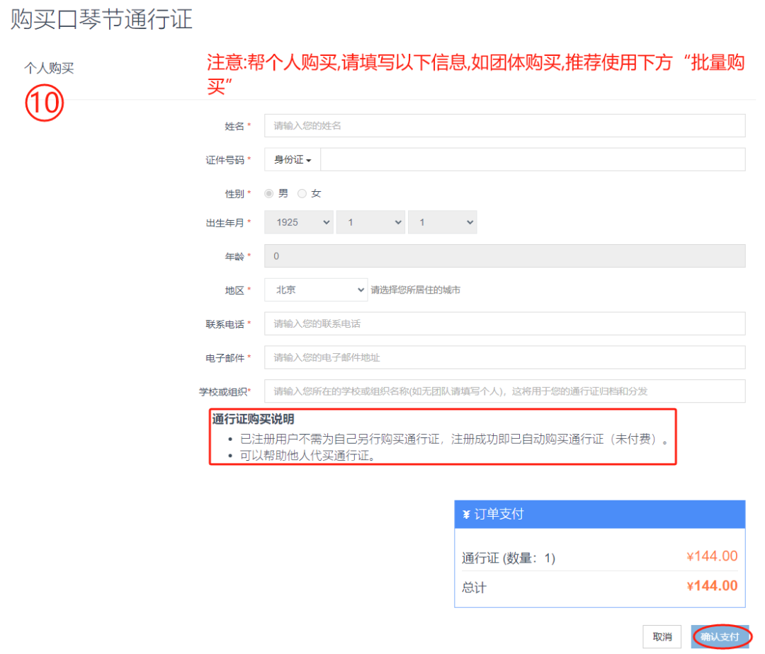 第十步:如果帮个人购买,您可以在“个人购买”下的表格内输入该成员的个人信息。检查填入的信息,若没有问题,则点击“确认支付”