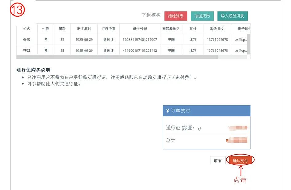 第十三步:如果仅仅购买通行证,核实成员信息无误后,请点击“确认支付”,支付请看上面第三步操作。如果还需要继续其他报名,请先继续其他报名,所有报名完成确认无误后再点击“我要支付”