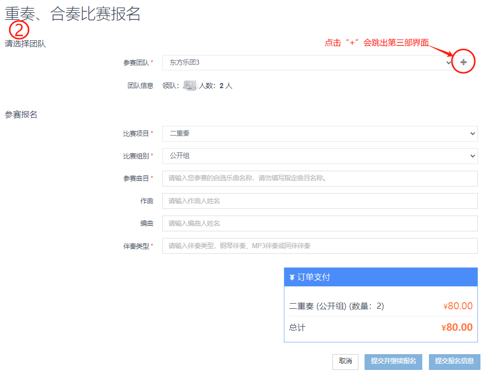 第二步:进入重奏、合奏报名页面,点击 “+”,出现以下页面