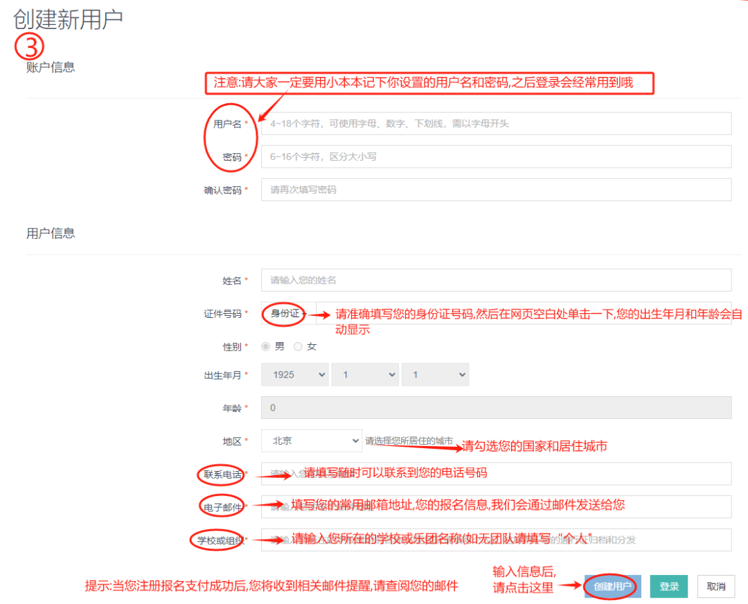 第三步:输入您的用户名和密码,并用小本本记下,千万不能忘喔!很重要!很重要!填写您的个人信息,并且一定要仔细核对后才能点击“创建用户”。
