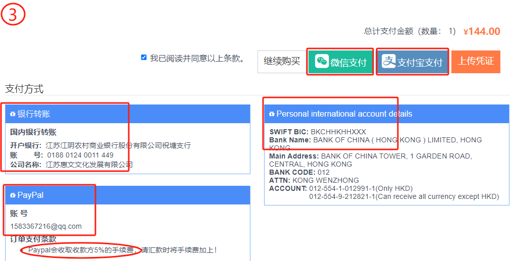 第三步:请选择付款方式,我们提供微信支付、支付宝支付、银行转账,境外可选择中国银行(香港)和PayPal两个支付方式。