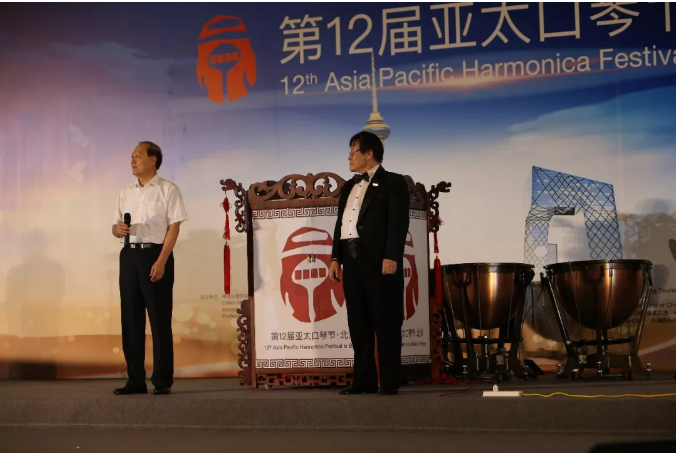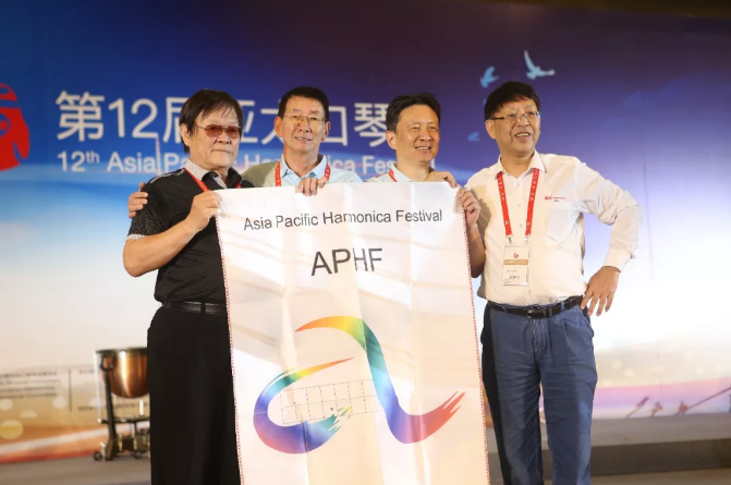 2018北京第十二届亚太口琴节与2020无锡第十三届亚太口琴节会旗交接仪式,仪式由主席白燕生和中国乐器协会口琴专业委员会会长周伟义把亚太口琴节会旗交给了第十三届亚太口琴节主席陈诗彝、执行主席丁进。